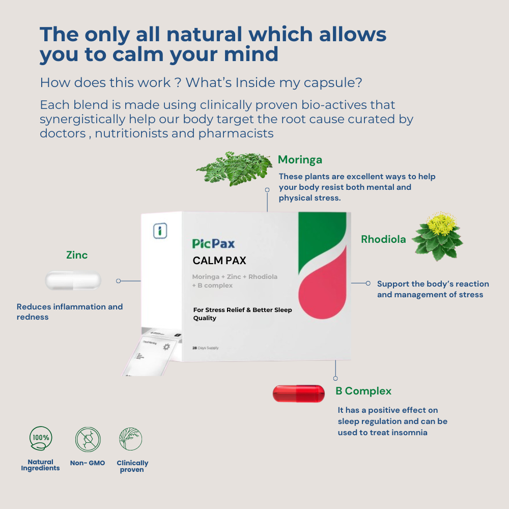 عندما يبدأ التوتر والليالي الطويلة التي لا تنام فيها في التأثير عليك، يقدم Calm Pax حلاً قويًا وطبيعيًا. يحتوي هذا المزيج الذي تم إعداده بواسطة خبراء على الزنك لتهدئة الجهاز العصبي، والمورينجا لمكافحة التوتر والقلق، والروديولا لتعزيز الوضوح العقلي والمرونة، ومجموعة فيتامينات ب لتحسين جودة النوم.