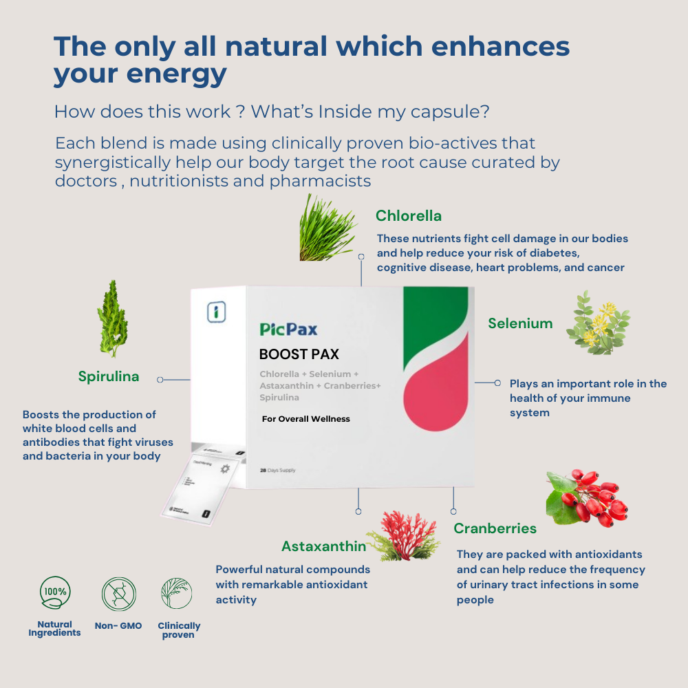 If you often feel fatigued, prone to illness, or lacking vitality, Boost Pax offers a powerful solution. This expertly curated daily supplement pack combines Chlorella, Selenium, Astaxanthin, Cranberries, and Spirulina to strengthen your immune system, boost energy levels, and protect against oxidative stress.