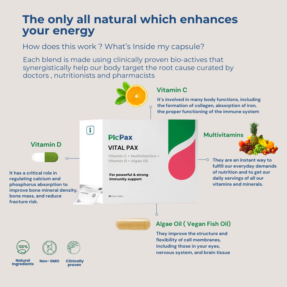 If you’re finding it hard to maintain your energy levels, immunity, and overall well-being, it might be time to replenish your body with essential nutrients. Vital Pax is specifically designed to address these concerns by providing a daily dose of key vitamins and minerals. This powerful blend includes Vitamin C to boost your immune system, Multivitamins to fill nutritional gaps, Omega-3 for heart and brain health, and Vitamin D for strong bones and overall vitality.