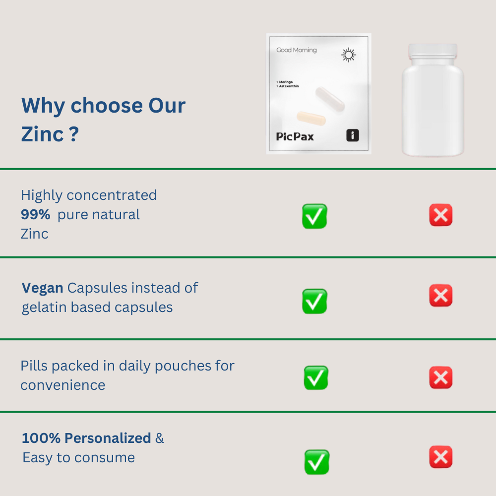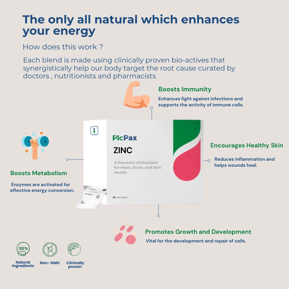 Zinc strengthens the immune system by supporting the development and function of immune cells. It promotes healthy skin, aids in wound healing, and supports normal growth and development. Zinc's role in enzyme activation helps maintain a robust metabolism, supporting the conversion of food into energy.